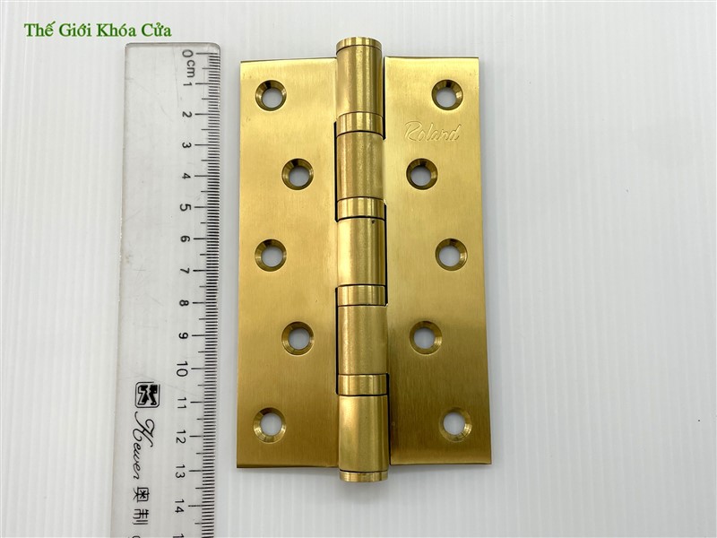 Bản lề được làm bằng Inox 201, bề mặt được mạ PVD cho màu vàng óng bắt mắt. Trục bản lề được làm bằng thép cho độ chịu lực cao. Bản lề là sản phẩm chính hãng của thương hiệu Roland.