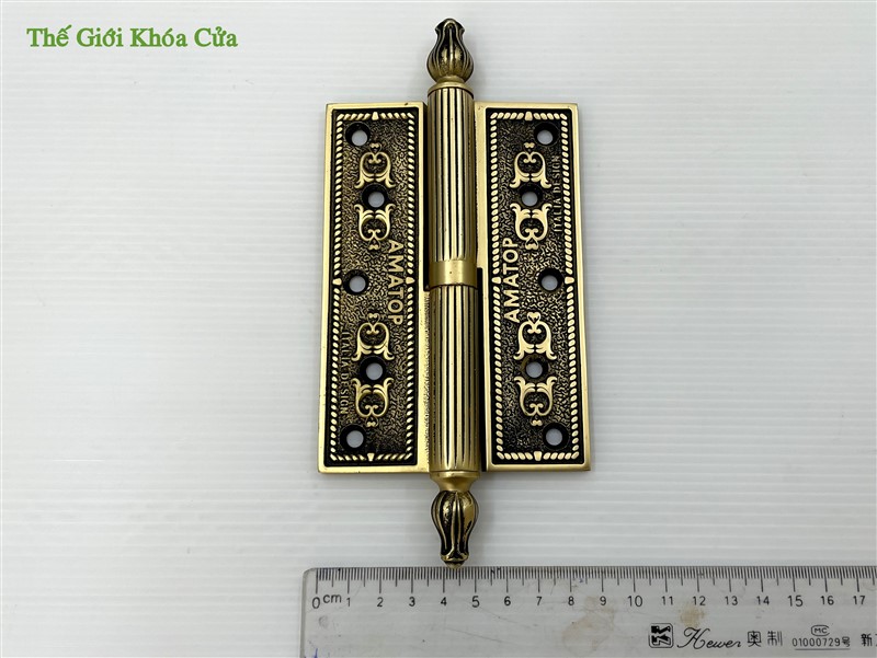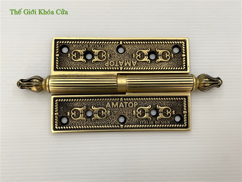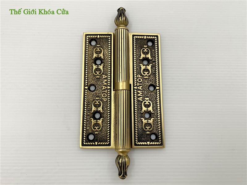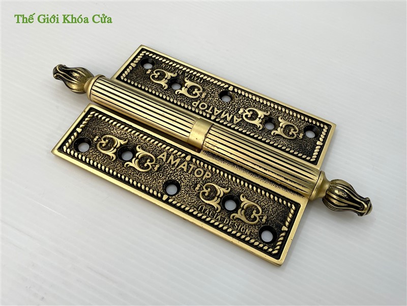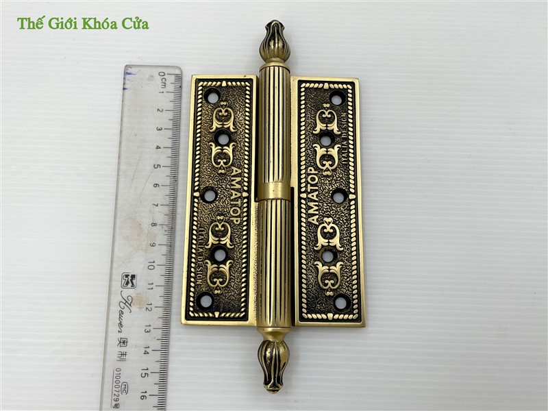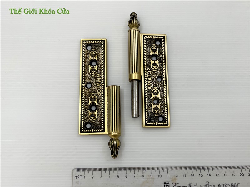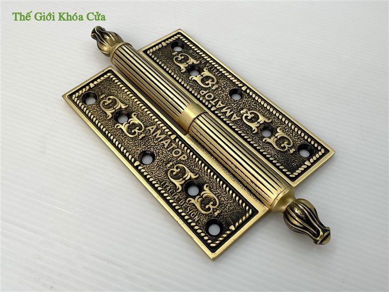 Bản lề có hoa văn tân cổ điển, góc cạnh sắc nét trau chuốt tinh tế. Bản lề có chiều dài cánh 13cm, phù hợp lắp cho cửa có độ dầy từ 3,8cm trở lên. Thường được lắp cho cửa thông phòng hoặc cửa chính bé.