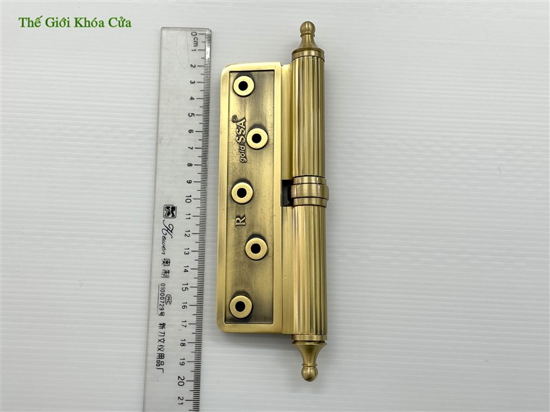 Bản lề cối bằng đồng thương hiệu Gold SSA 6 inch được làm hoàn toàn bằng đồng cao cấp, trục bản lề được làm bằng thép tôi, phía trong ổ xoay có vòng bi cho độ chịu lực cao. Bản lề có kích thước lớn phù hợp lắp cho cửa có độ dầy từ 5cm trở lên.