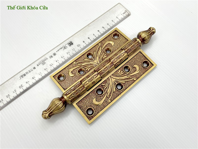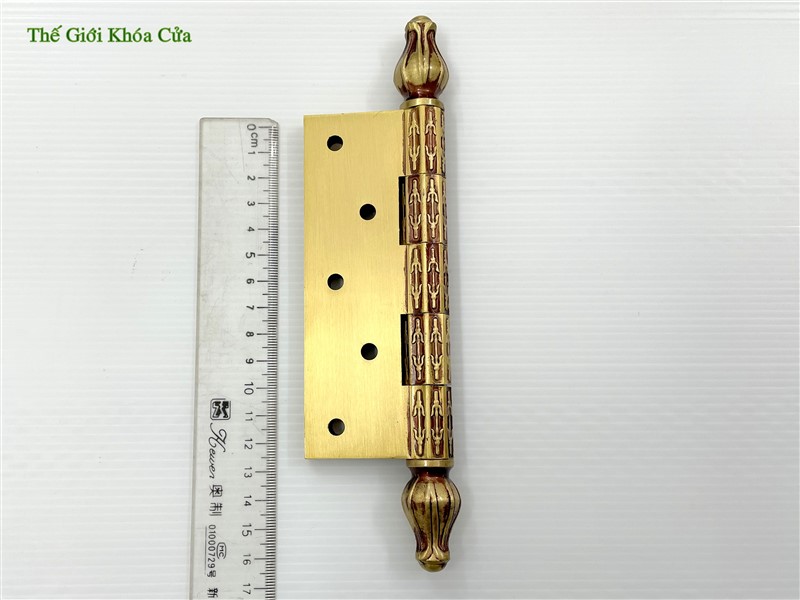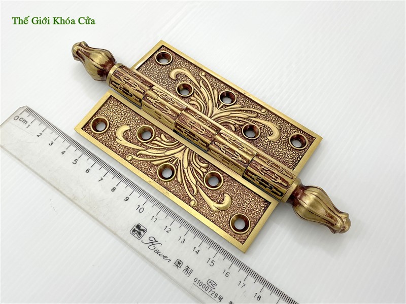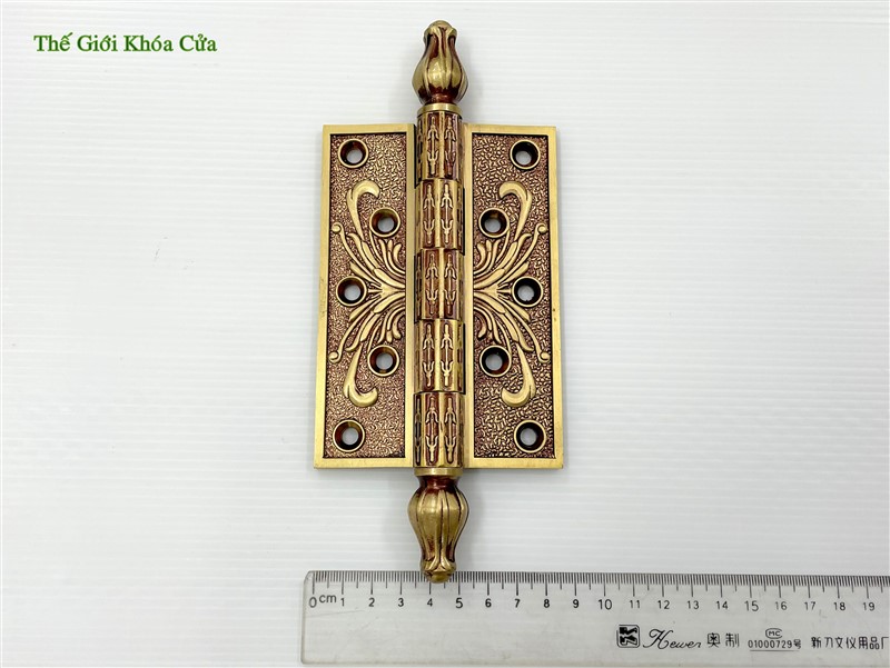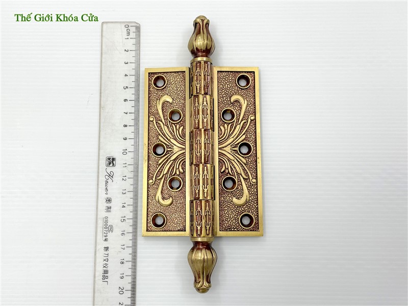 Bản lề đồng hoa văn cánh bướm loại 13 cam được làm bằng đồng thau, bề mặt được tạo màu đồng thời phủ 2k chống ô xi hóa. Bản lề có chóp dạng búp, hoa văn bắt mắt phù hợp với phong cách kiến trúc tân cổ điển, cổ điển truyền thống.