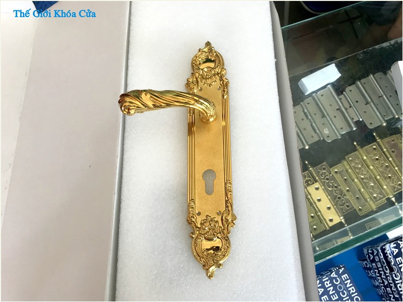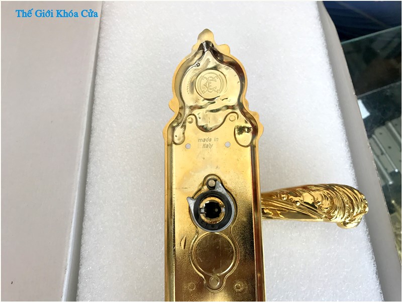 Khóa cửa nhập khẩu Italy Enrico Cassina dòng Lavinia - dùng lắp cho cửa gỗ được làm hoàn toàn từ những thanh đồng cao cấp bằng phương pháp dập nóng tạo hoa văn hoàn toàn thủ công. Bề mặt của khóa được mạ vàng 24k trong 2000 phút mạ bởi hãng mạ danh tiếng Ompico.