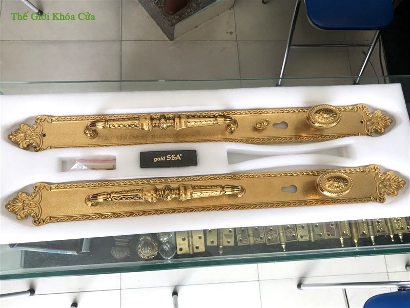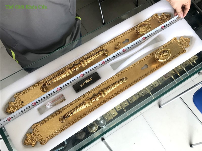 Khóa cửa đại sảnh Gold SSA LA-6868-PVD được nhập khẩu nguyên chiếc bởi Gold SSA Thái Lan. Khóa có kích thước rất lớn ( dài 81cm ) thường được lắp cho cửa đại sảnh, cửa đại hội có kích thước lớn, hoa văn cầu kì.