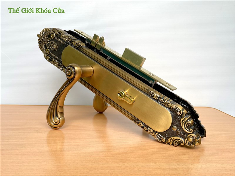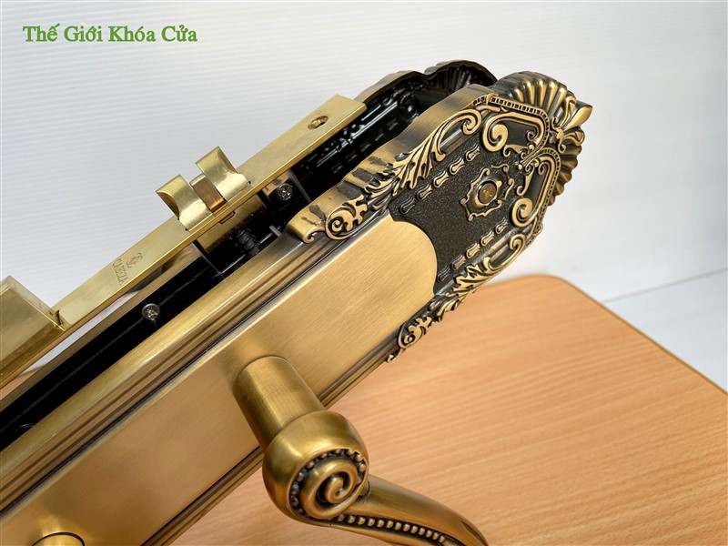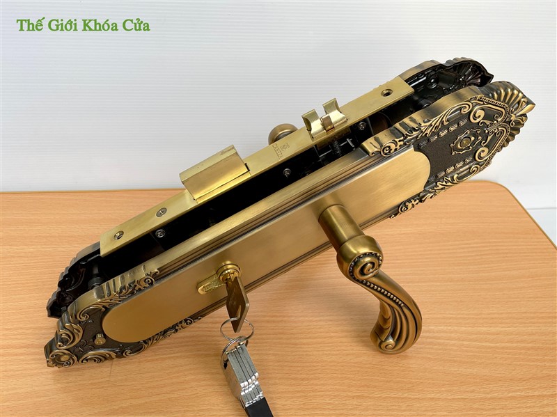 Khóa được làm bằng đồng thau, hoa văn khóa dạng cổ điển cầu kì, tay khóa dạng uốn lượn cong. khóa thường được lắp cho nhà có kiến trúc hoa văn cầu kì.