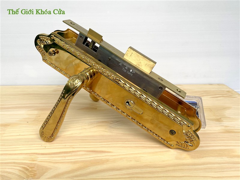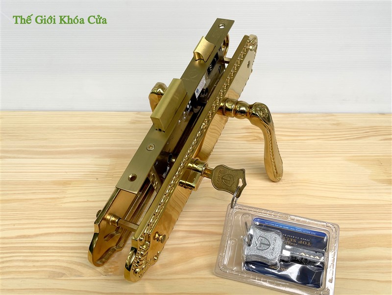 Khóa được làm bằng đồng thau cao cấp bề mặt tay ốp khóa được mạ PVD màu vàng bóng sang trọng, chống bay màu theo thời gian. Tay khóa dạng thẳng tròn giúp hình dáng khóa trông vững chắc khi lắp đặt và thuận tiện khi nắm cầm.