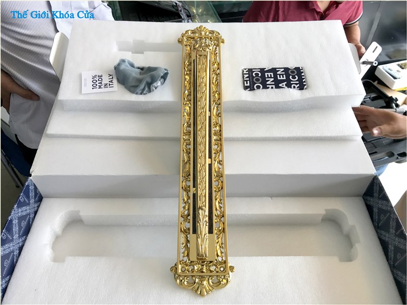Tay nắm khóa đại sảnh nhập khẩu Italy Enrico Cassina dòng Emprie - dùng cho cửa đại sảnh được làm hoàn toàn từ những thanh đồng cao cấp bằng phương pháp dập nóng tạo hoa văn hoàn toàn thủ công. Bề mặt của tay nắm khóa được mạ vàng 24k trong 2000 phút mạ bởi hãng mạ danh tiếng Ompico.